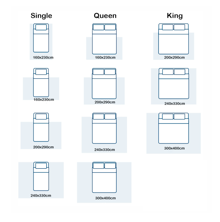 A rug in the bedroom is all about a warm and comfortable underfoot, especially for those with hard flooring! For those wanting a larger rug for the room, we recommend a rectangular rug that sits right under the lower end of the bed and extends at least 50cm beyond the sides of the bed (depending on the size of your bedroom).