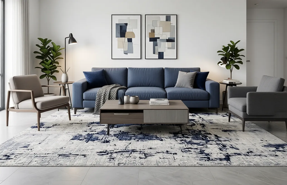 For a classic living layout, place the rug in the centre of the room and place the front legs of your sofa and armchairs on the rug. This will help create a better aesthetic and cleaner appearance.
