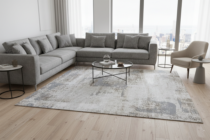 For a classic living layout, place the rug in the centre of the room and place the front legs of your sofa and armchairs on the rug. This will help create a better aesthetic and cleaner appearance.
