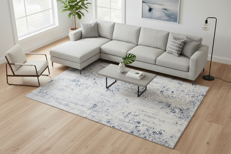 For a classic living layout, place the rug in the centre of the room and place the front legs of your sofa and armchairs on the rug. This will help create a better aesthetic and cleaner appearance.