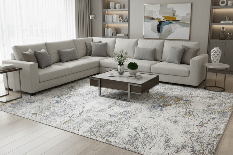 For a classic living layout, place the rug in the centre of the room and place the front legs of your sofa and armchairs on the rug. This will help create a better aesthetic and cleaner appearance.