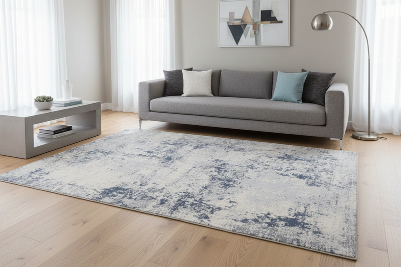 For a classic living layout, place the rug in the centre of the room and place the front legs of your sofa and armchairs on the rug. This will help create a better aesthetic and cleaner appearance.