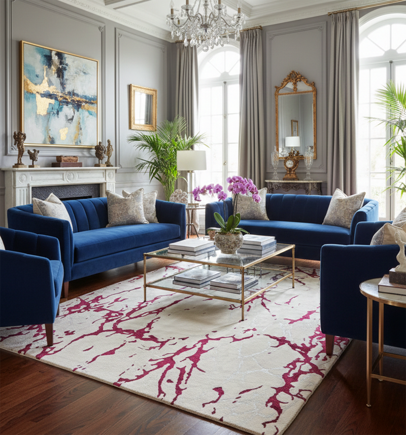 For a classic living layout, place the rug in the centre of the room and place the front legs of your sofa and armchairs on the rug. This will help create a better aesthetic and cleaner appearance.
