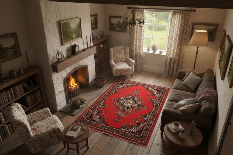 For a classic living layout, place the rug in the centre of the room and place the front legs of your sofa and armchairs on the rug. This will help create a better aesthetic and cleaner appearance.