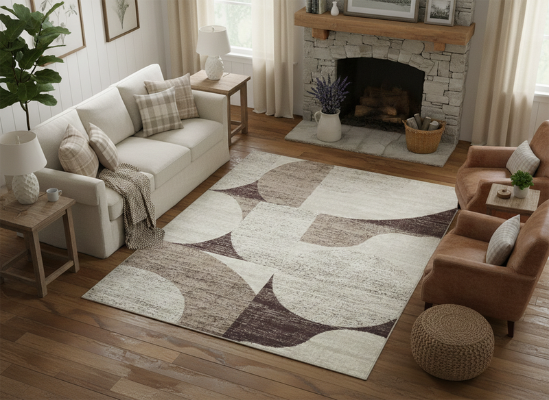 For a classic living layout, place the rug in the centre of the room and place the front legs of your sofa and armchairs on the rug. This will help create a better aesthetic and cleaner appearance.