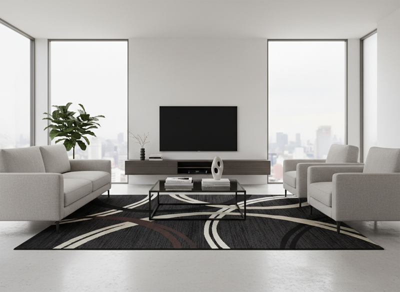 For a classic living layout, place the rug in the centre of the room and place the front legs of your sofa and armchairs on the rug. This will help create a better aesthetic and cleaner appearance.