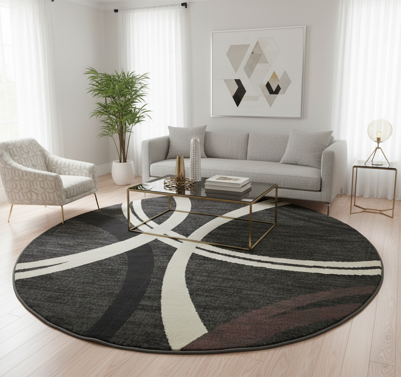 For a classic living layout, place the rug in the centre of the room and place the front legs of your sofa and armchairs on the rug. This will help create a better aesthetic and cleaner appearance.