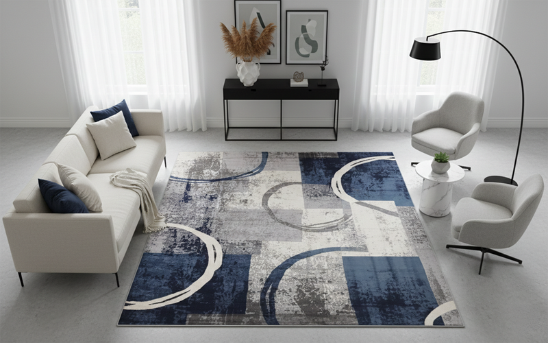 For a classic living layout, place the rug in the centre of the room and place the front legs of your sofa and armchairs on the rug. This will help create a better aesthetic and cleaner appearance.