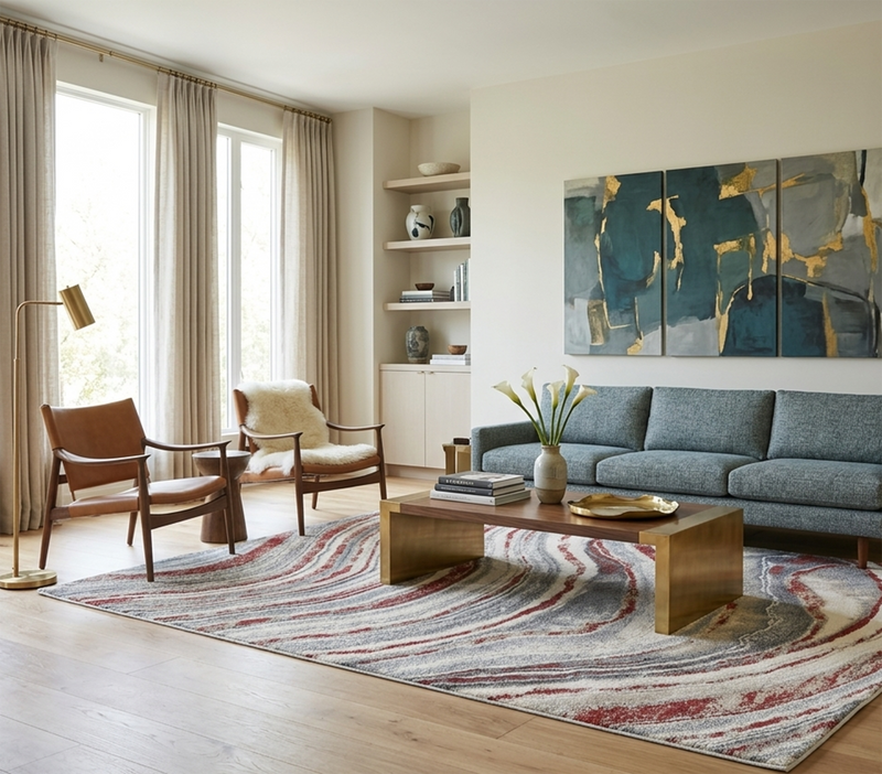 For a classic living layout, place the rug in the centre of the room and place the front legs of your sofa and armchairs on the rug. This will help create a better aesthetic and cleaner appearance.