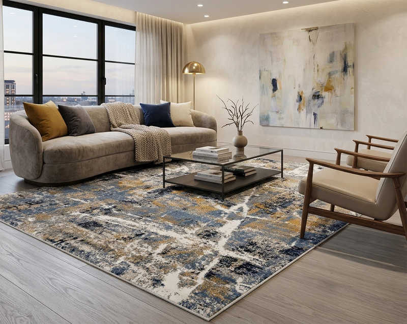 For a classic living layout, place the rug in the centre of the room and place the front legs of your sofa and armchairs on the rug. This will help create a better aesthetic and cleaner appearance.