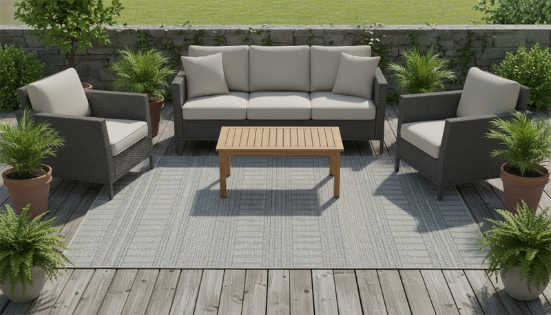 For high traffic, spill-risk areas like the dining area, we recommend a low-pile rug and easy-to-clean material like polypropylene for a rug.xt