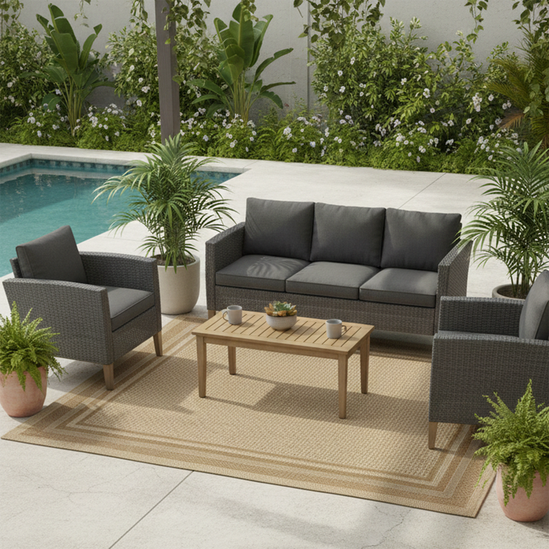 For high traffic, spill-risk areas like the dining area, we recommend a low-pile rug and easy-to-clean material like polypropylene for a rug.xt