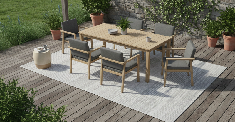 For high traffic, spill-risk areas like the dining area, we recommend a low-pile rug and easy-to-clean material like polypropylene for a rug.xt