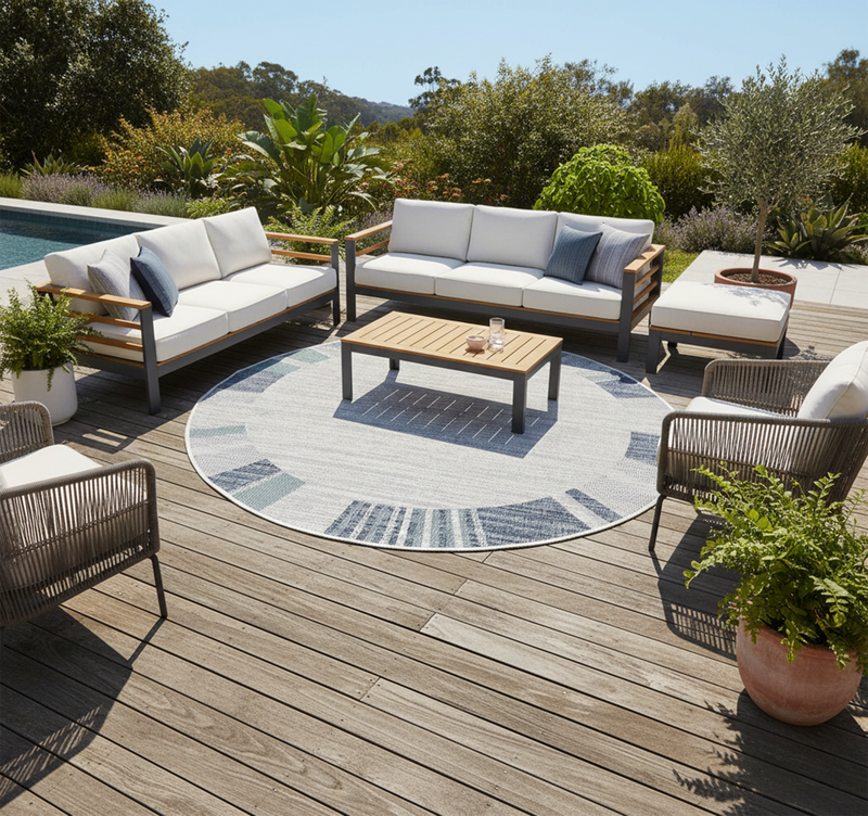 For a classic living layout, place the rug in the centre of the room and place the front legs of your sofa and armchairs on the rug. This will help create a better aesthetic and cleaner appearance.