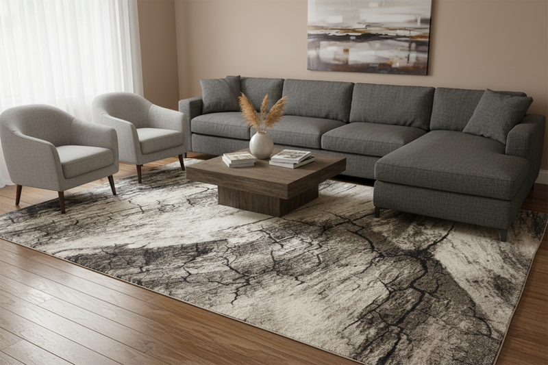 For a classic living layout, place the rug in the centre of the room and place the front legs of your sofa and armchairs on the rug. This will help create a better aesthetic and cleaner appearance.