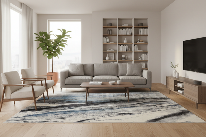 For a classic living layout, place the rug in the centre of the room and place the front legs of your sofa and armchairs on the rug. This will help create a better aesthetic and cleaner appearance.