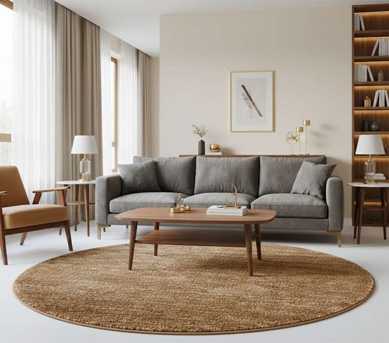 For a classic living layout, place the rug in the centre of the room and place the front legs of your sofa and armchairs on the rug. This will help create a better aesthetic and cleaner appearance.