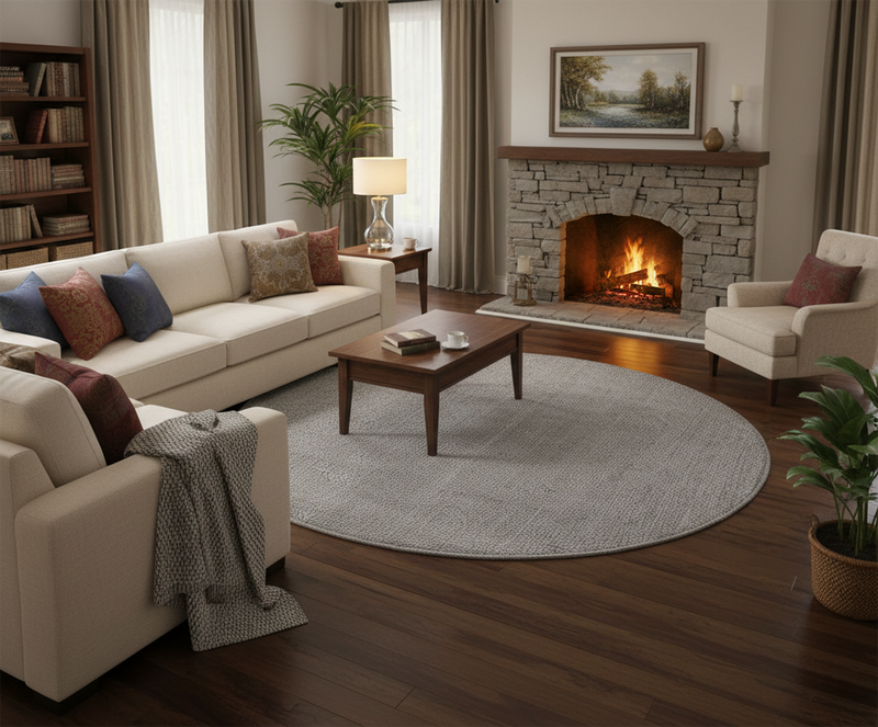 For a classic living layout, place the rug in the centre of the room and place the front legs of your sofa and armchairs on the rug. This will help create a better aesthetic and cleaner appearance.