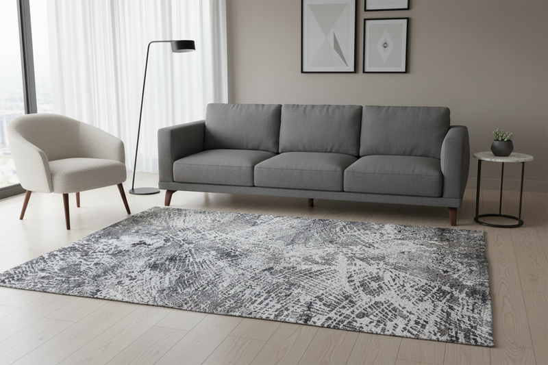 For a classic living layout, place the rug in the centre of the room and place the front legs of your sofa and armchairs on the rug. This will help create a better aesthetic and cleaner appearance.