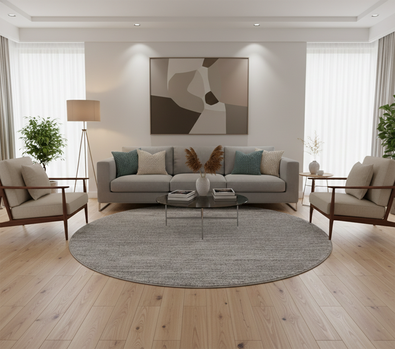 For a classic living layout, place the rug in the centre of the room and place the front legs of your sofa and armchairs on the rug. This will help create a better aesthetic and cleaner appearance.