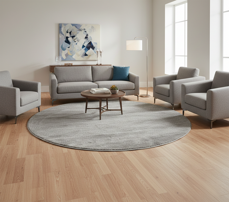 For a classic living layout, place the rug in the centre of the room and place the front legs of your sofa and armchairs on the rug. This will help create a better aesthetic and cleaner appearance.