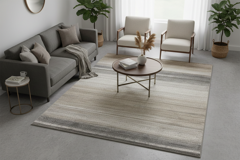 For a classic living layout, place the rug in the centre of the room and place the front legs of your sofa and armchairs on the rug. This will help create a better aesthetic and cleaner appearance.