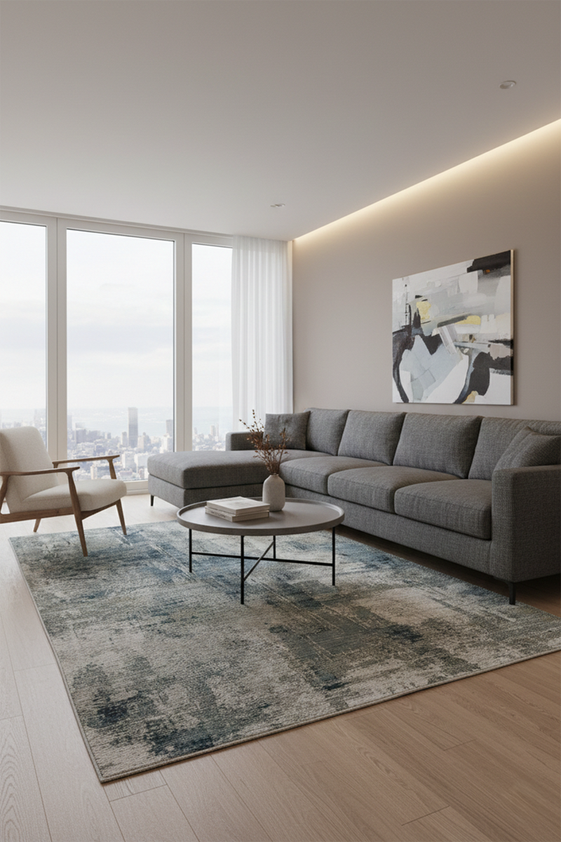 For a classic living layout, place the rug in the centre of the room and place the front legs of your sofa and armchairs on the rug. This will help create a better aesthetic and cleaner appearance.