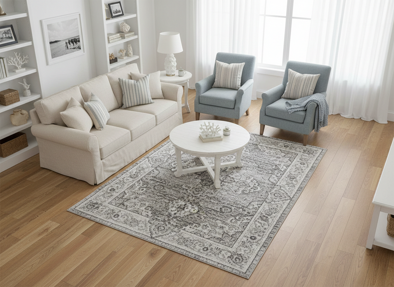 For a classic living layout, place the rug in the centre of the room and place the front legs of your sofa and armchairs on the rug. This will help create a better aesthetic and cleaner appearance.
