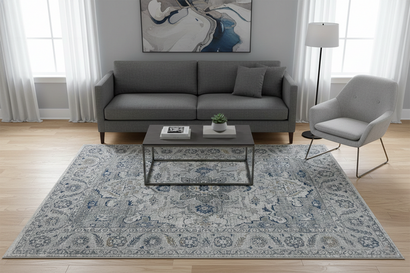 For a classic living layout, place the rug in the centre of the room and place the front legs of your sofa and armchairs on the rug. This will help create a better aesthetic and cleaner appearance.