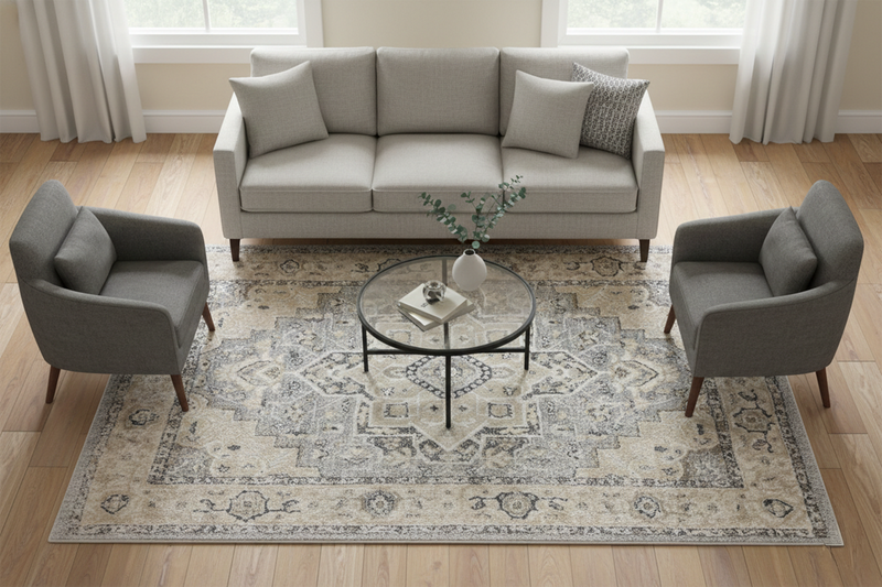 For a classic living layout, place the rug in the centre of the room and place the front legs of your sofa and armchairs on the rug. This will help create a better aesthetic and cleaner appearance.