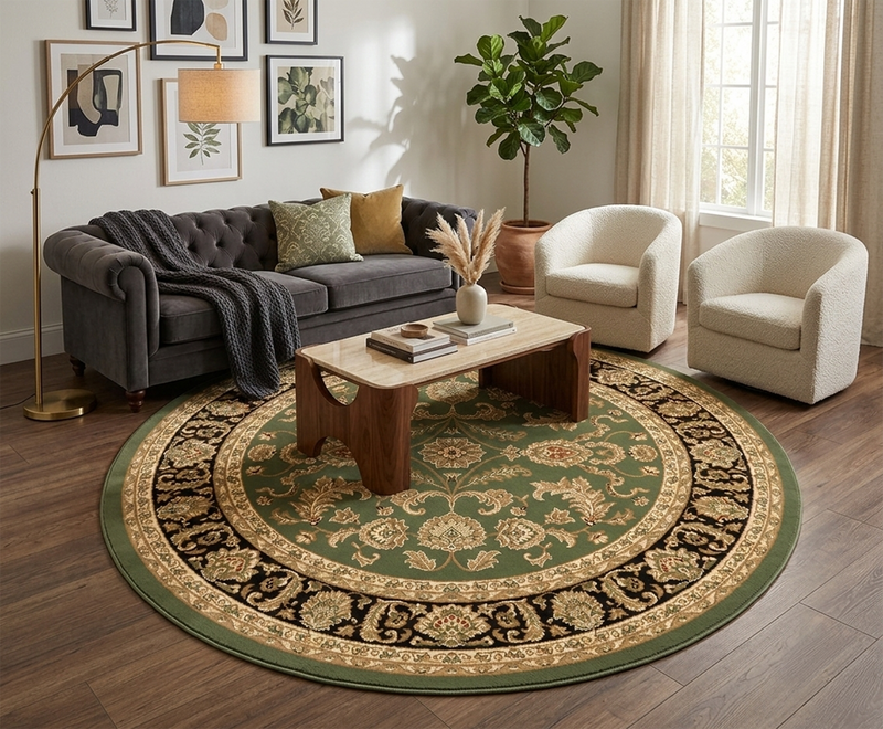 For a classic living layout, place the rug in the centre of the room and place the front legs of your sofa and armchairs on the rug. This will help create a better aesthetic and cleaner appearance.