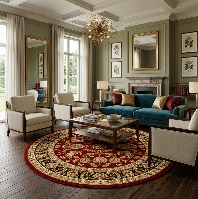 For a classic living layout, place the rug in the centre of the room and place the front legs of your sofa and armchairs on the rug. This will help create a better aesthetic and cleaner appearance.