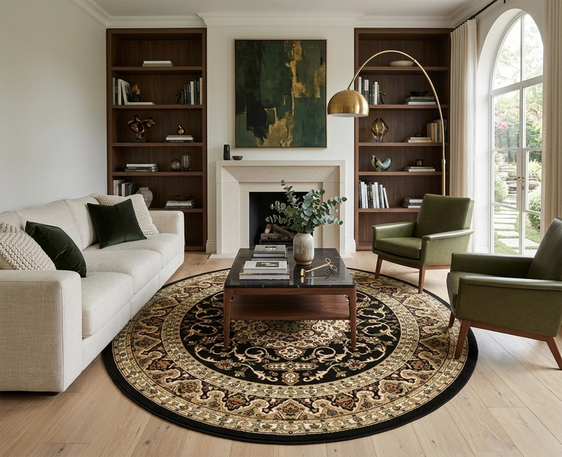 For a classic living layout, place the rug in the centre of the room and place the front legs of your sofa and armchairs on the rug. This will help create a better aesthetic and cleaner appearance.