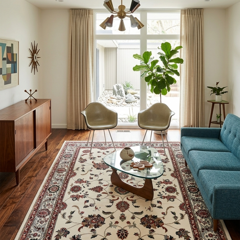 For a classic living layout, place the rug in the centre of the room and place the front legs of your sofa and armchairs on the rug. This will help create a better aesthetic and cleaner appearance.