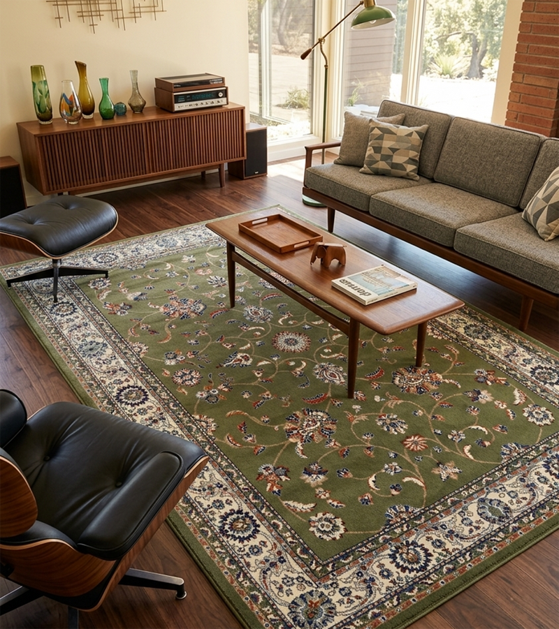 For a classic living layout, place the rug in the centre of the room and place the front legs of your sofa and armchairs on the rug. This will help create a better aesthetic and cleaner appearance.