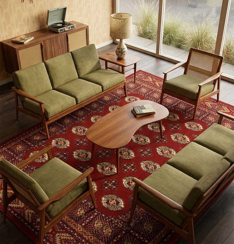 For a classic living layout, place the rug in the centre of the room and place the front legs of your sofa and armchairs on the rug. This will help create a better aesthetic and cleaner appearance.