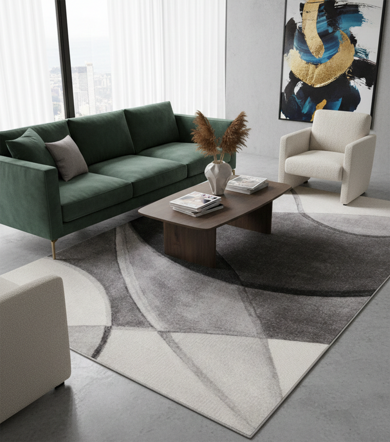 For a classic living layout, place the rug in the centre of the room and place the front legs of your sofa and armchairs on the rug. This will help create a better aesthetic and cleaner appearance.