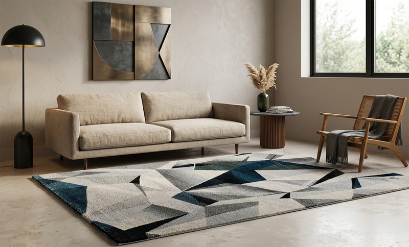 For a classic living layout, place the rug in the centre of the room and place the front legs of your sofa and armchairs on the rug. This will help create a better aesthetic and cleaner appearance.