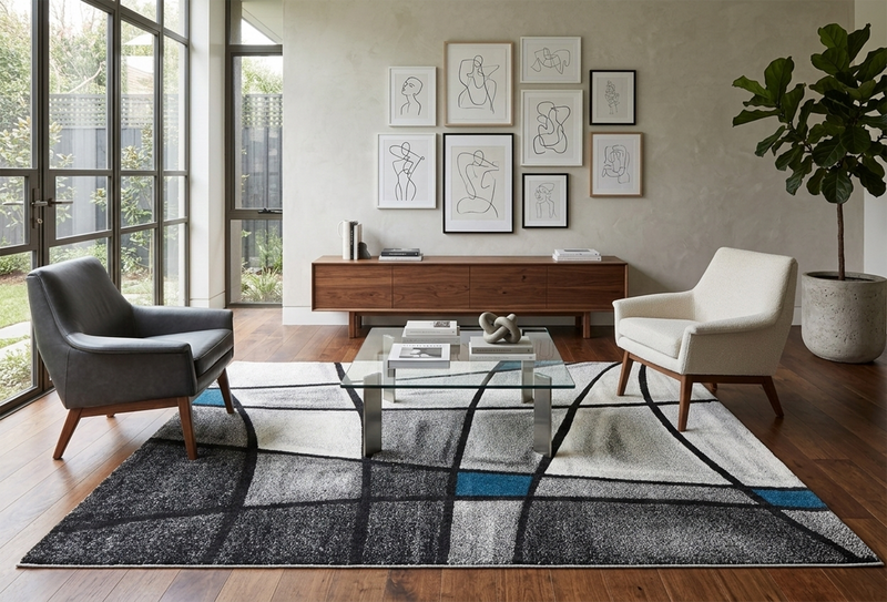 For a classic living layout, place the rug in the centre of the room and place the front legs of your sofa and armchairs on the rug. This will help create a better aesthetic and cleaner appearance.