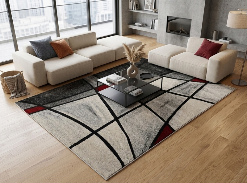 For a classic living layout, place the rug in the centre of the room and place the front legs of your sofa and armchairs on the rug. This will help create a better aesthetic and cleaner appearance.