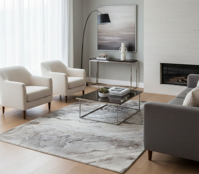 For a classic living layout, place the rug in the centre of the room and place the front legs of your sofa and armchairs on the rug. This will help create a better aesthetic and cleaner appearance.
