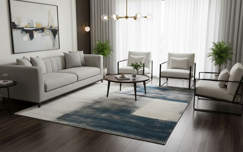 For a classic living layout, place the rug in the centre of the room and place the front legs of your sofa and armchairs on the rug. This will help create a better aesthetic and cleaner appearance.